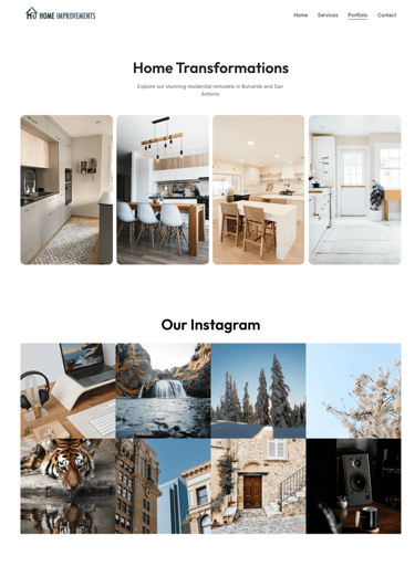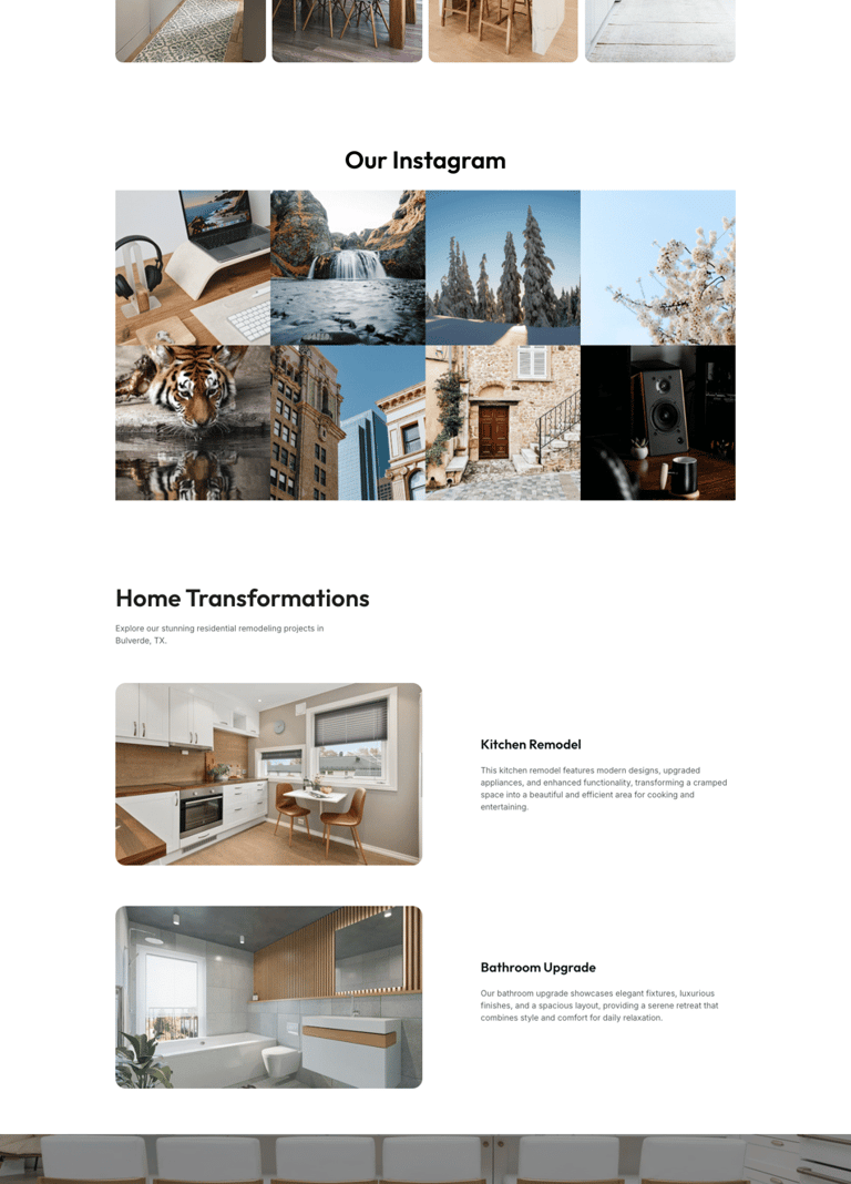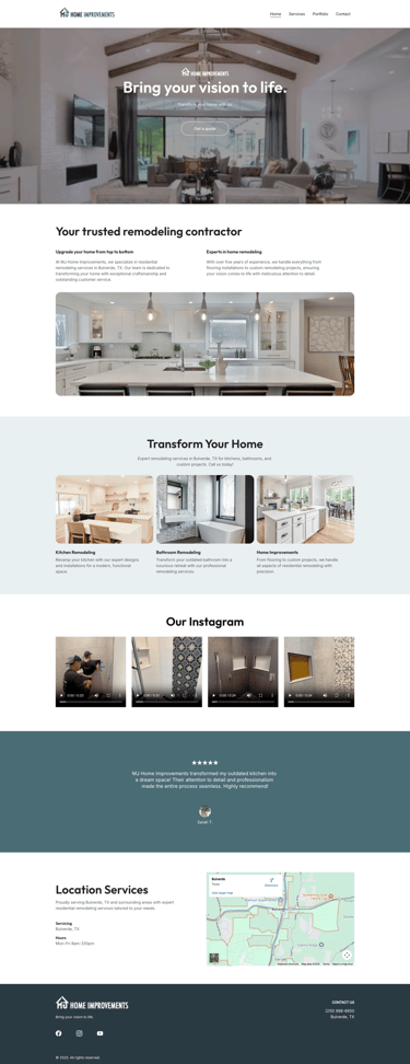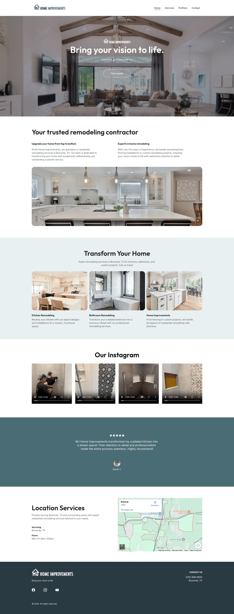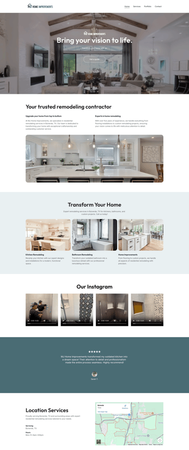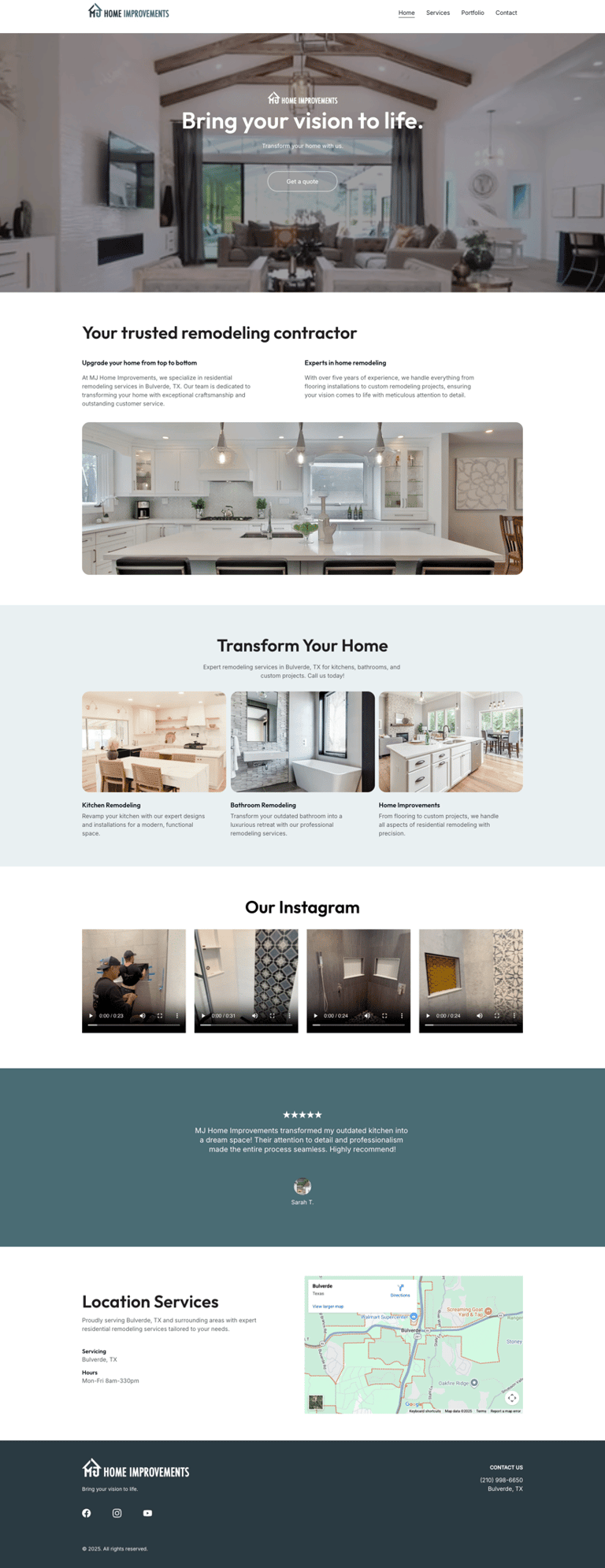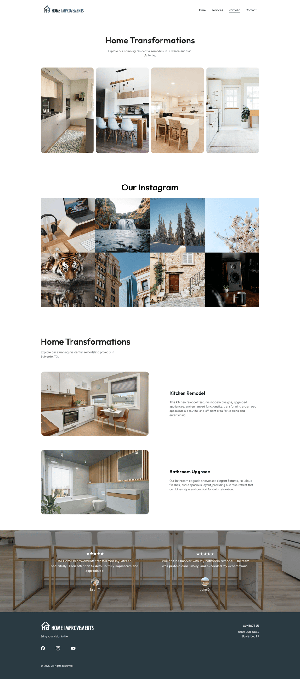 Project Gallery for MJ Home Improvements. Features a high-resolution showcase of recent remodels alongside an integrated social media feed. Designed to build trust through transparency and visual proof of quality.