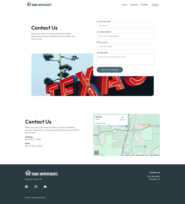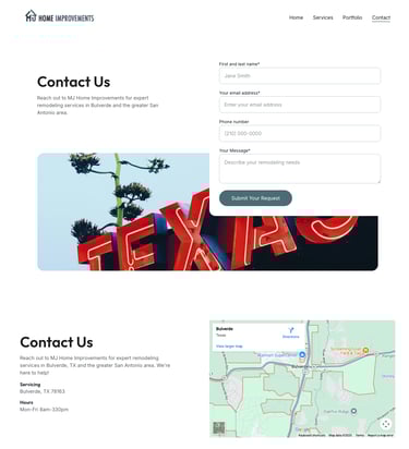 Inquiry section for MJ Home Improvements. This clean, two-column layout pairs an inviting visual with a direct contact form. It allows homeowners to easily request consultations, ensuring a seamless connection between potential clients and the contractor.