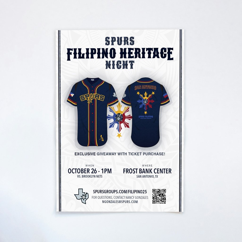 Official game day flyer for the Spurs vs. Nets season opener. This layout was created to announce Filipino Heritage Night at the Frost Bank Center, featuring key game details and showcasing the limited-edition promotional jersey.